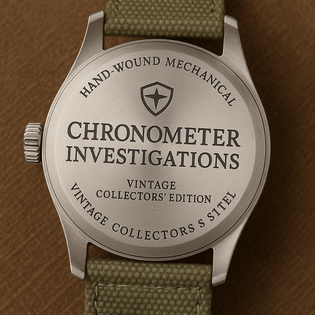 Caseback Solid stainless (optionally blank to engrave “Chronometer Investigations”)