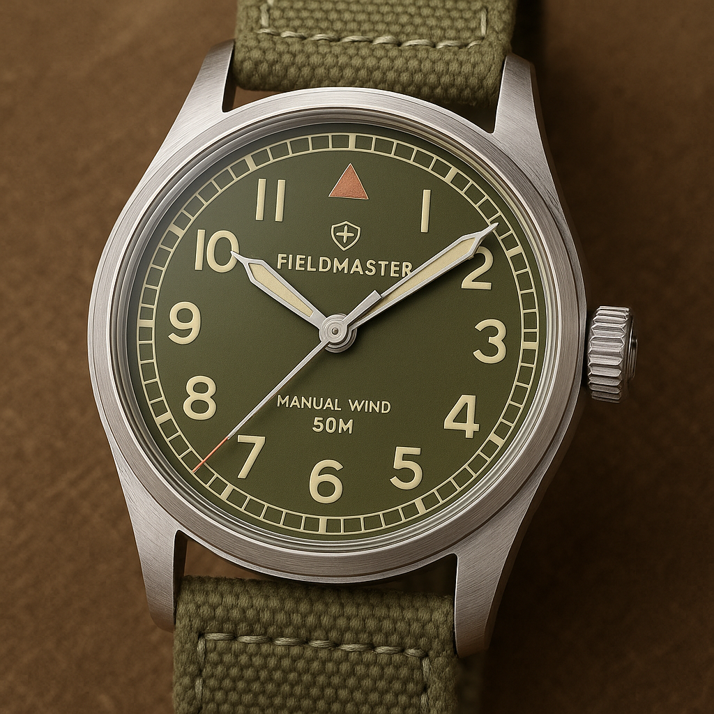 A robust, reliable, and elegant mechanical field watch designed for everyday wear, inspired by mid-20th-century military watches. Minimalist, readable, and purely mechanical—with a touch of modern craftsmanship.